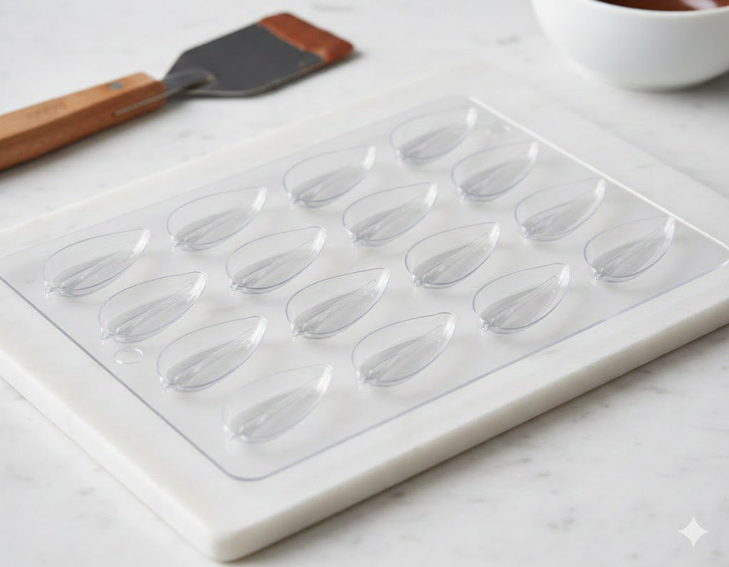 Simple chocolate leaf plastic mold size 4 cm x 2.5 cm thickness 5 mm. 6 cavities per mold.
